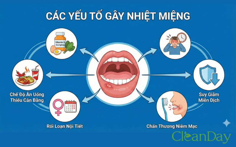 Nguyên nhân gây nhiệt miệng thường không đơn lẻ mà là sự kết hợp của nhiều yếu tố như thiếu vitamin nhóm B, stress kéo dài, suy giảm miễn dịch, chấn thương niêm mạc, rối loạn nội tiết hoặc chế độ ăn uống thiếu cân bằng. Vì vậy, việc điều trị không nên chỉ tập trung vào làm dịu vết loét mà cần quan tâm đến nguyên nhân nền.