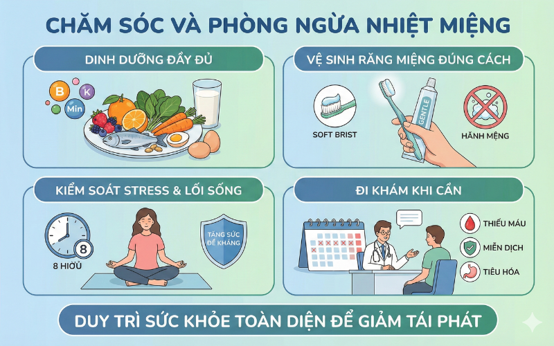 Việc kiểm soát stress, ngủ đủ giấc và duy trì lối sống lành mạnh giúp tăng cường sức đề kháng, từ đó giảm tần suất tái phát. Với những trường hợp nhiệt miệng kéo dài, tái diễn nhiều lần trong tháng, người bệnh nên đi khám để kiểm tra các bệnh lý nền như thiếu máu, rối loạn miễn dịch hoặc bệnh tiêu hóa.