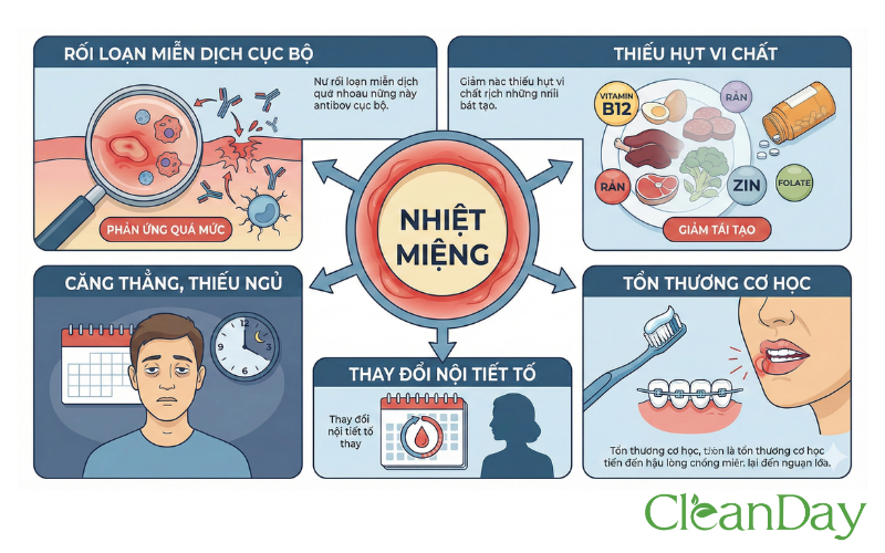 Theo y học hiện đại, dù nguyên nhân chính xác chưa hoàn toàn được xác định, nhưng nhiệt miệng liên quan đến nhiều yếu tố: