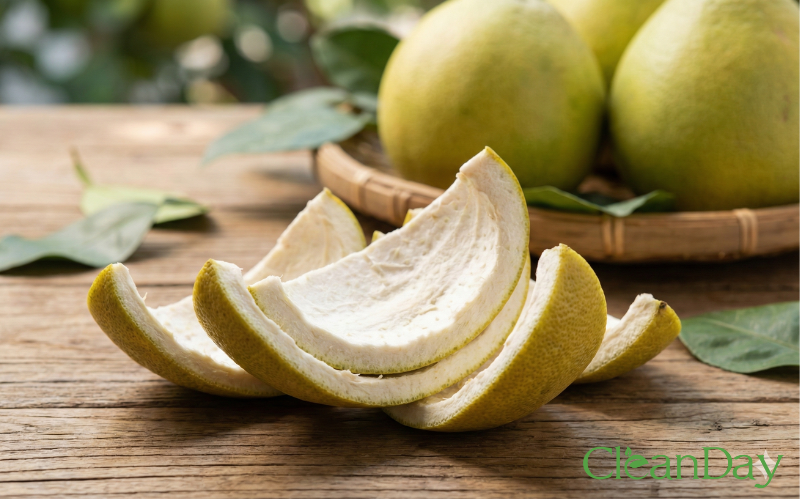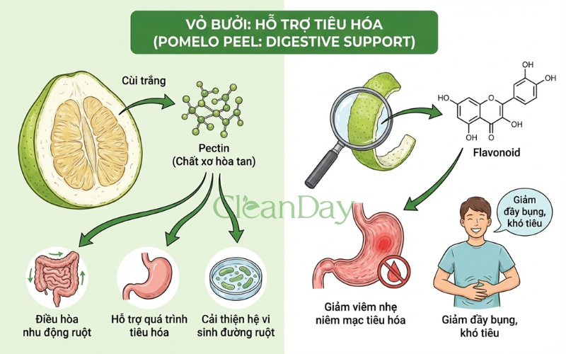 Một trong những công dụng của vỏ bưởi được nhắc đến nhiều nhất là hỗ trợ tiêu hóa. Phần cùi trắng của vỏ bưởi chứa lượng pectin dồi dào – một dạng chất xơ hòa tan có lợi cho đường ruột. Pectin giúp điều hòa nhu động ruột, hỗ trợ quá trình tiêu hóa và góp phần cải thiện hệ vi sinh đường ruột.