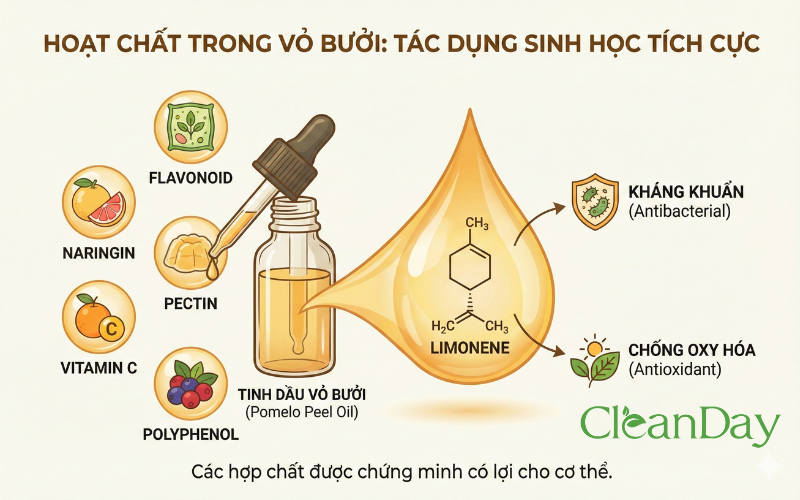 Tinh dầu vỏ bưởi chứa hàm lượng cao limonene – hợp chất tạo mùi thơm đặc trưng và có khả năng kháng khuẩn, chống oxy hóa. Ngoài ra, vỏ bưởi còn chứa flavonoid, naringin, pectin, vitamin C và các hợp chất polyphenol. Đây đều là những hoạt chất được chứng minh có tác dụng sinh học tích cực đối với cơ thể. Sự kết hợp giữa tinh dầu và các hợp chất chống oxy hóa giúp vỏ bưởi không chỉ có giá trị trong y học cổ truyền mà còn được quan tâm trong nghiên cứu dược lý hiện đại.