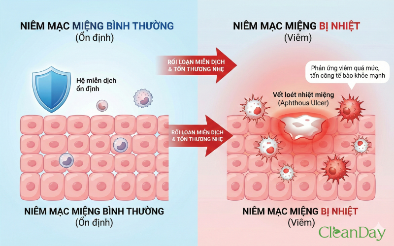 Một trong những nguyên nhân quan trọng nhất gây nhiệt miệng là rối loạn miễn dịch tại chỗ. Khi niêm mạc miệng bị kích thích hoặc tổn thương nhẹ, hệ miễn dịch ở một số người phản ứng quá mức, tấn công cả các tế bào niêm mạc khỏe mạnh. Phản ứng viêm này làm xuất hiện các vết loét nông đặc trưng của nhiệt miệng.