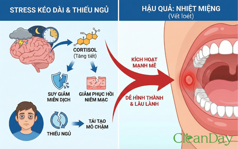 Stress kéo dài là yếu tố kích hoạt mạnh mẽ các đợt nhiệt miệng. Khi căng thẳng, cơ thể tăng tiết cortisol, làm suy giảm miễn dịch và ảnh hưởng đến khả năng phục hồi của niêm mạc. Đồng thời, thiếu ngủ khiến cơ thể không có đủ thời gian tái tạo mô, làm vết loét dễ hình thành và lâu lành hơn.