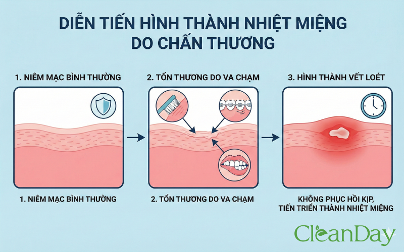 Niêm mạc miệng rất mỏng và nhạy cảm. Những chấn thương nhỏ như cắn phải môi hoặc má, đánh răng quá mạnh, dùng bàn chải cứng, niềng răng cọ xát hay răng sắc cạnh đều có thể làm tổn thương lớp bảo vệ tự nhiên. Nếu cơ thể không kịp phục hồi, vùng tổn thương này sẽ tiến triển thành vết loét nhiệt miệng.