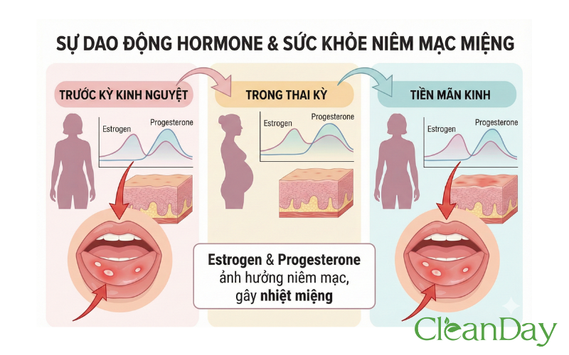 Sự dao động hormone, đặc biệt là estrogen và progesterone, có thể ảnh hưởng đến sức khỏe niêm mạc miệng. Nhiều phụ nữ gặp tình trạng nhiệt miệng trước kỳ kinh nguyệt, trong thai kỳ hoặc giai đoạn tiền mãn kinh.