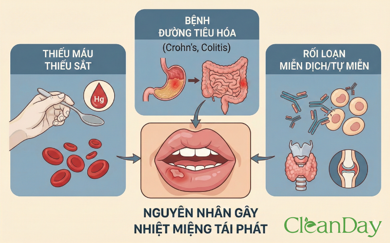 Nếu nhiệt miệng xuất hiện thường xuyên, kéo dài hoặc đi kèm các triệu chứng toàn thân, có thể liên quan đến bệnh lý nền như thiếu máu thiếu sắt, bệnh đường tiêu hóa (viêm ruột, bệnh Crohn), rối loạn miễn dịch hoặc bệnh tự miễn.