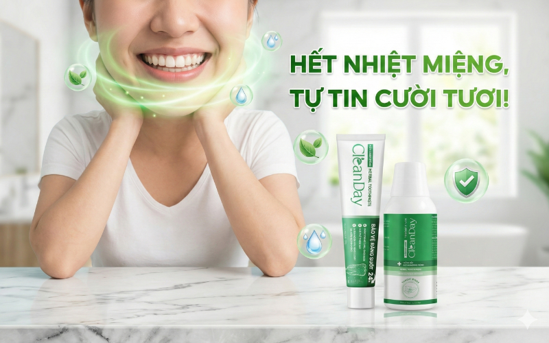 Bên cạnh việc điều chỉnh chế độ ăn uống và sinh hoạt, chăm sóc khoang miệng đúng cách đóng vai trò quan trọng trong việc hỗ trợ làm lành vết nhiệt miệng. Sử dụng kem đánh răng CleanDay kết hợp nước súc họng CleanDay giúp làm sạch nhẹ nhàng khoang miệng, hạn chế vi khuẩn và các tác nhân gây kích ứng niêm mạc. Nhờ công thức dịu nhẹ, không gây xót rát, bộ đôi này góp phần giảm viêm, giảm đau và tạo môi trường thuận lợi để niêm mạc miệng phục hồi nhanh hơn. Việc duy trì thói quen vệ sinh răng miệng đều đặn với sản phẩm phù hợp có thể giúp rút ngắn thời gian lành nhiệt miệng và hạn chế nguy cơ tái phát.