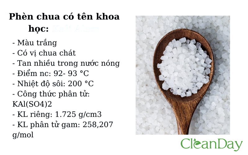 Phèn chua có tên khoa học là Kali nhôm sunfat ngậm 12 phân tử nước (KAl(SO₄)₂·12H₂O). Đây là một loại muối kép, thường tồn tại ở dạng tinh thể không màu hoặc trắng trong, có vị chát, tan được trong nước. Đặc tính quan trọng của phèn chua là khả năng làm se niêm mạc, sát khuẩn nhẹ và kết tủa protein, từ đó lý giải nhiều công dụng của nó trong y học và đời sống.