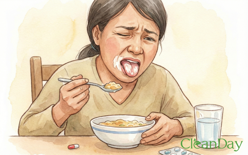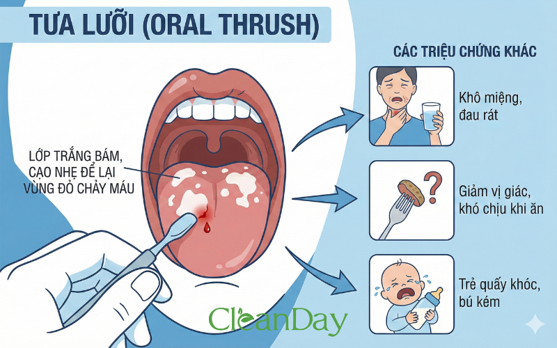 Dấu hiệu đặc trưng nhất của tưa lưỡi là lớp trắng bám trên bề mặt lưỡi. Khi cạo nhẹ, lớp này có thể bong ra, để lại vùng niêm mạc đỏ, dễ chảy máu và gây đau rát. Người bị tưa lưỡi thường có cảm giác khô miệng, rát lưỡi, giảm vị giác hoặc khó chịu khi ăn uống. Ở trẻ nhỏ, tưa lưỡi có thể khiến bé quấy khóc, bú kém hoặc bỏ ăn.